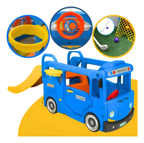 Com o Playground Ônibus Escorregador é possível se divertir imaginando ser um motorista e escorregando no escorregador na versão ônibus escorregador ou se preferir pode deixar a criança se divertido jogando mini golf.